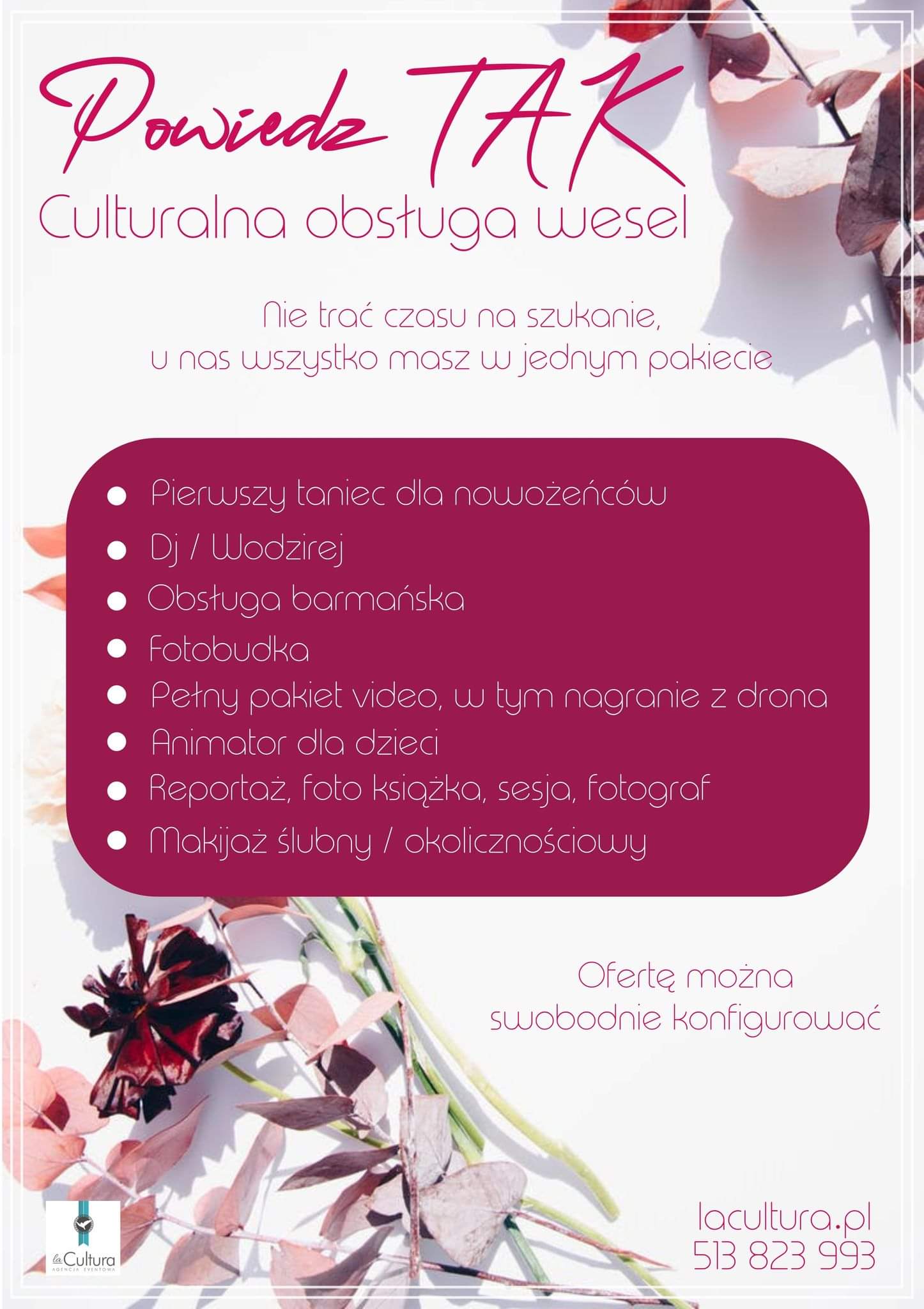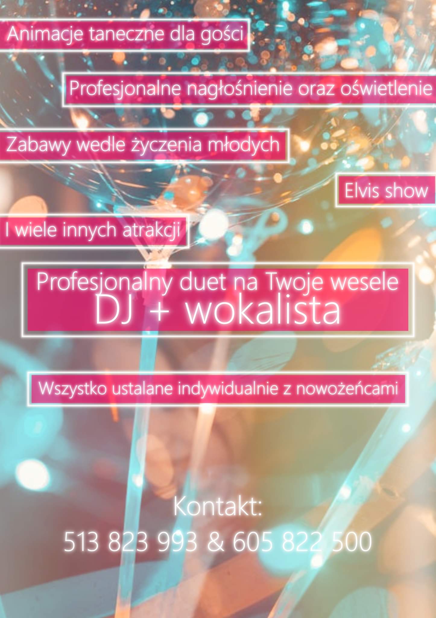 Gwarantujemy: nauka pierwszego tańca, Dj/Wodzirej, obsługa barmańska, fotobudka, animator dla dzieci, pakiet video oraz foto.