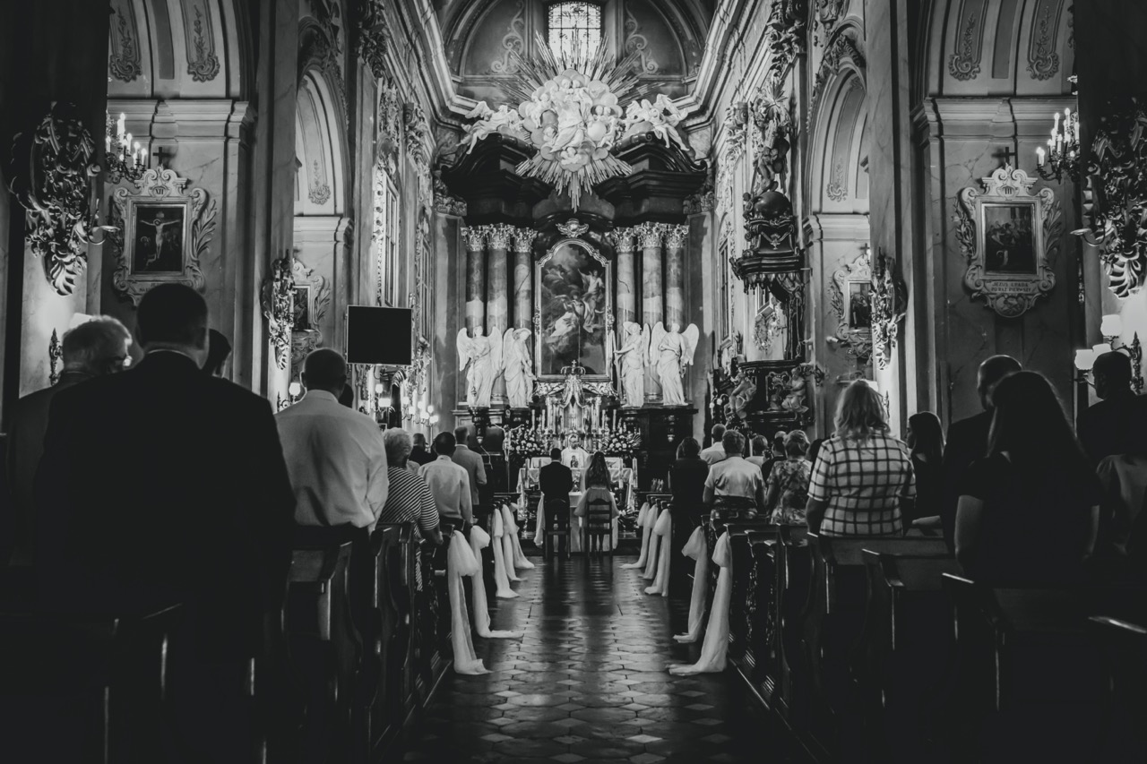 na fotografiach z ceremonii ślubnej w kościele / lub w USC oraz ze zdjęciami z gośćmi